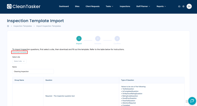 On the Inspection Template Import page, there is a downloadable CSV template available.