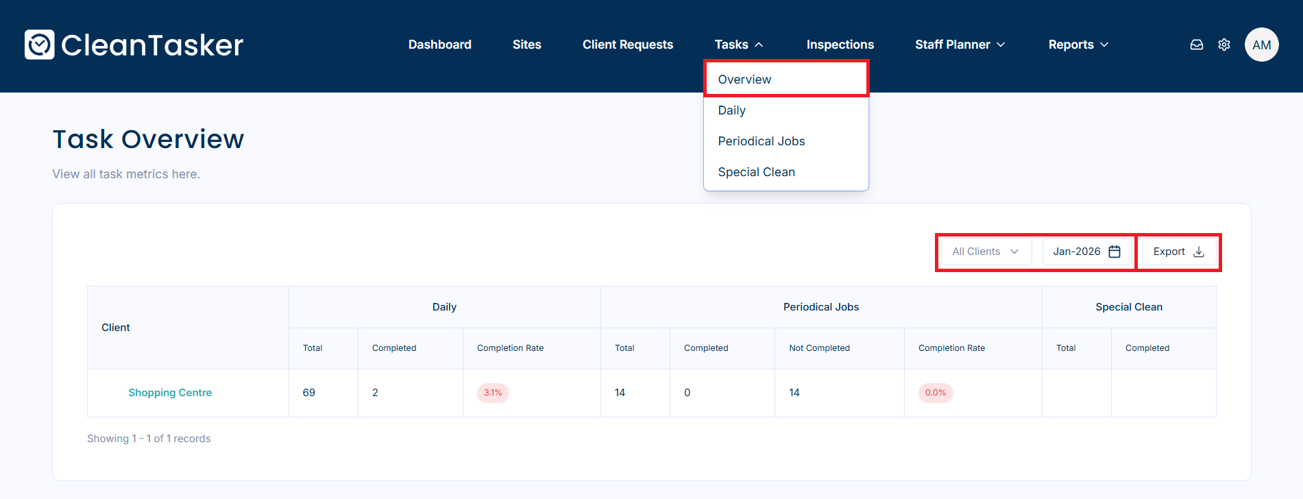 The Task Overview page provides a summary of all task types and their completion rates, giving managers insight into team performance at a glance. You can also refine and export this data for reporting purposes.