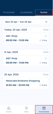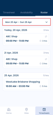 - Your rostered shifts for the current week will be displayed.