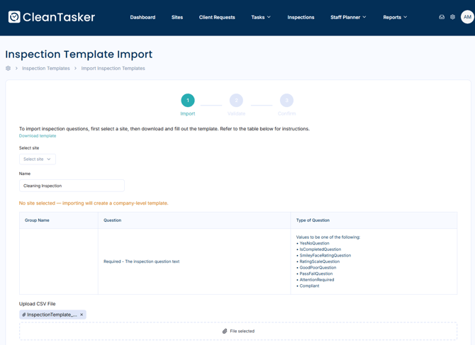 For help formatting the CSV file correctly, visit the Formatting Your CSV File for Inspection Template Import article.