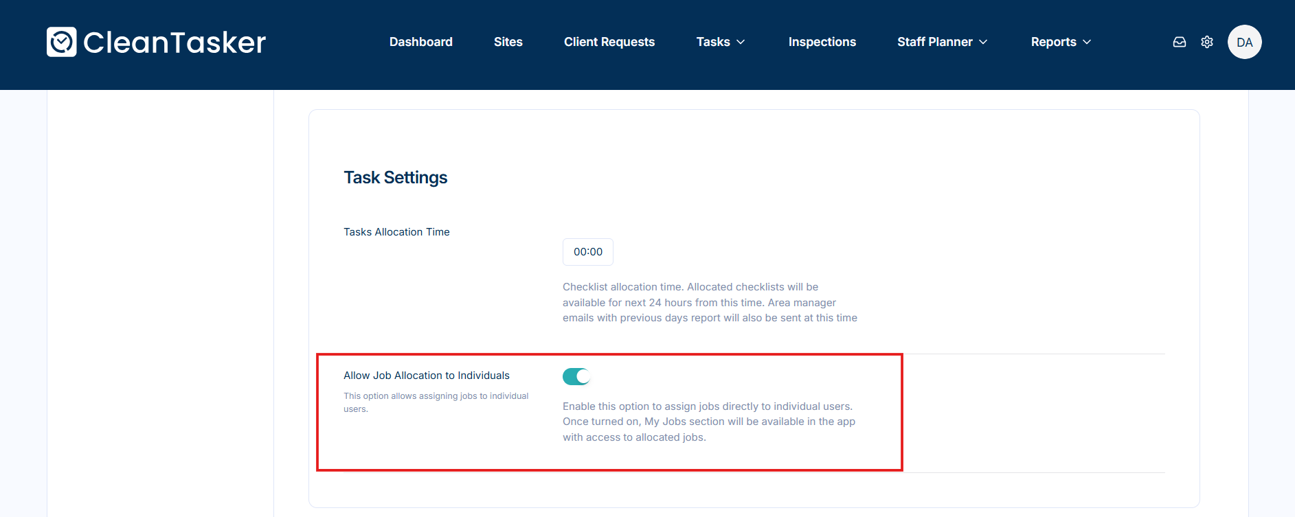 Managers can configure how jobs are assigned within the application through the Company Settings page. By enabling job allocation to individuals you assign periodic tasks to specific cleaners.