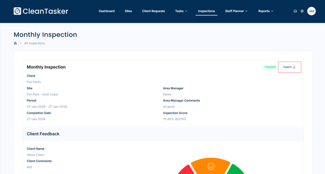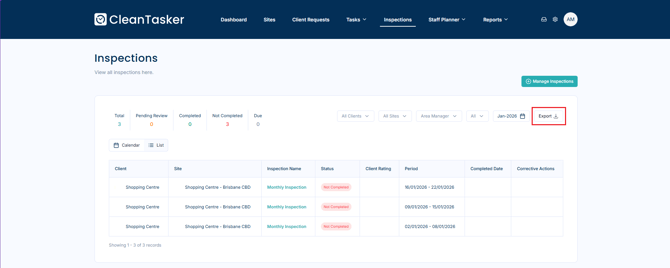 On the Inspections page, select Export on the right-hand side of the page.