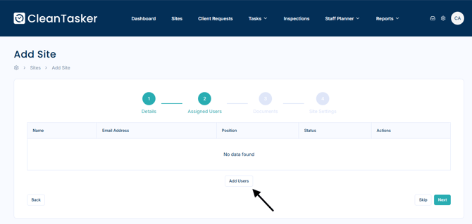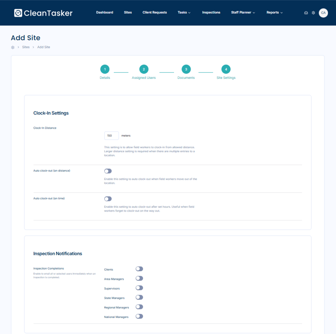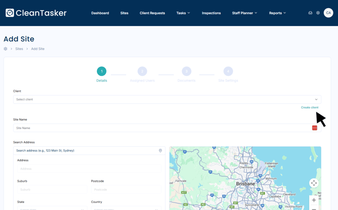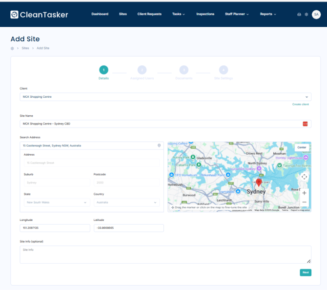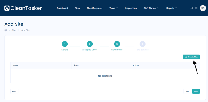 This guide walks you through creating and configuring a new site in CleanTasker. The setup process includes four straightforward steps: adding site details, assigning users, uploading documents, and configuring site settings.