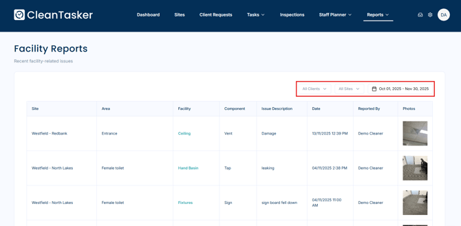 This report allows you to view and manage all facility-related issues submitted across sites. You can review detailed reports, filter results to find specific issues, and export individual reports as a PDF for record-keeping or sharing.