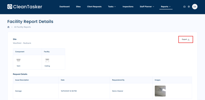 On the Facility Report Details page, click the Export button in the top-right corner to download the report as a PDF file.