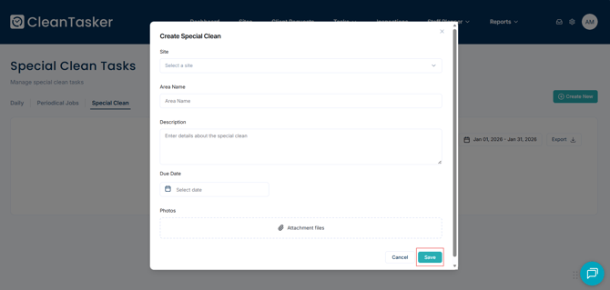 Once all fields are filled out, click Save to create the special clean task.